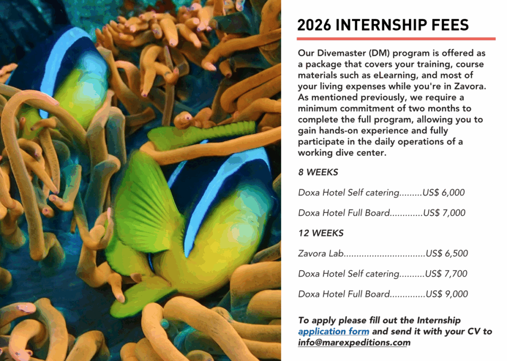 Being a Divemaster is much more than leading dives. You take on a vital safety role — not just for your clients, but also on behalf of your dive centre and aspiring scientists under MAR. As a Divemaster intern, you’ll be actively involved in a range of daily responsibilities such as maintaining boats and dive gear, filling tanks, rinsing and organising equipment, and ensuring the dive centre remains clean and efficient.